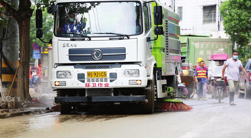 目前,随县柳林镇主街道淤泥、杂物已清理完毕。图为环卫清扫车正在柳林镇交通大道冲洗路面。