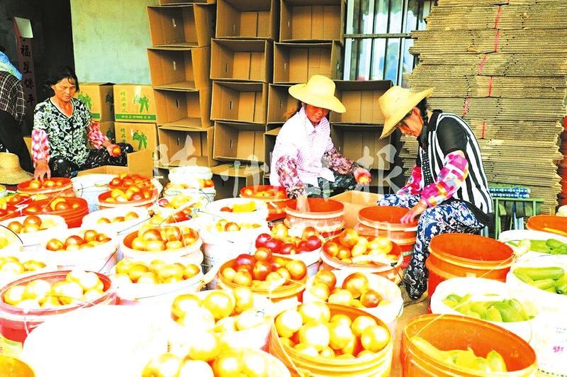 曾都区万店镇深入实施乡村振兴战略,按照“百亩示范、千亩引领、万亩提升”工作思路,大力发展蔬菜产业,带领群众走共同致富之路。图为菜农正在熟练地将刚刚采摘的黄瓜、西红柿等新鲜蔬菜打包装箱,发往全国各地。