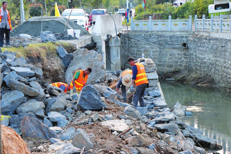 曾都区交通运输局抢抓晴好天气,组织对辖区内水毁公路设施摸排和修复,确保道路安全畅通。图为8月19日,工人正在对洛阳镇张畈村水毁公路挡墙进行修复。