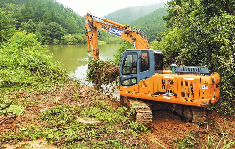 为保证汛期安全,曾都区府河镇枣树坳村对全村的水库和堰塘进行排查,消除安全隐患。图为8月23日,该村组织挖掘机清理并深挖石房冲水库泄洪槽。 (随州日报全媒记者李文军、通讯员谢强摄)