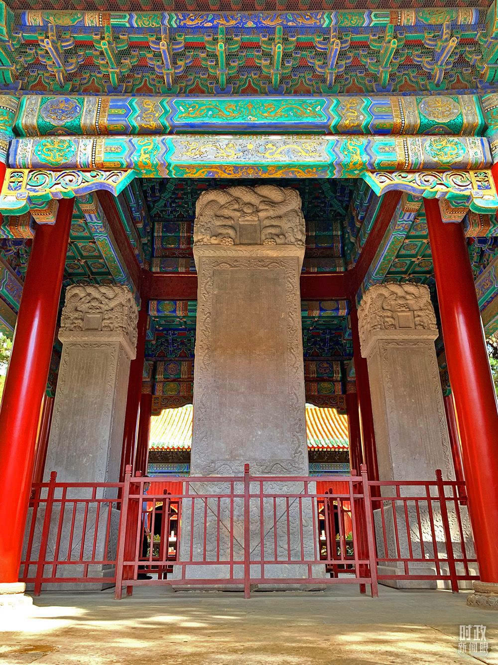△普宁寺寓意全国各民族安其居、乐其业。(总台记者祁文杰拍摄) 在普宁寺的碑亭,矗立着三块巨大的石碑——《普宁寺碑》《平定准噶尔勒铭伊犁之碑》《平定准噶尔后勒铭伊犁之碑》,均用满蒙汉藏四种文字镌刻。