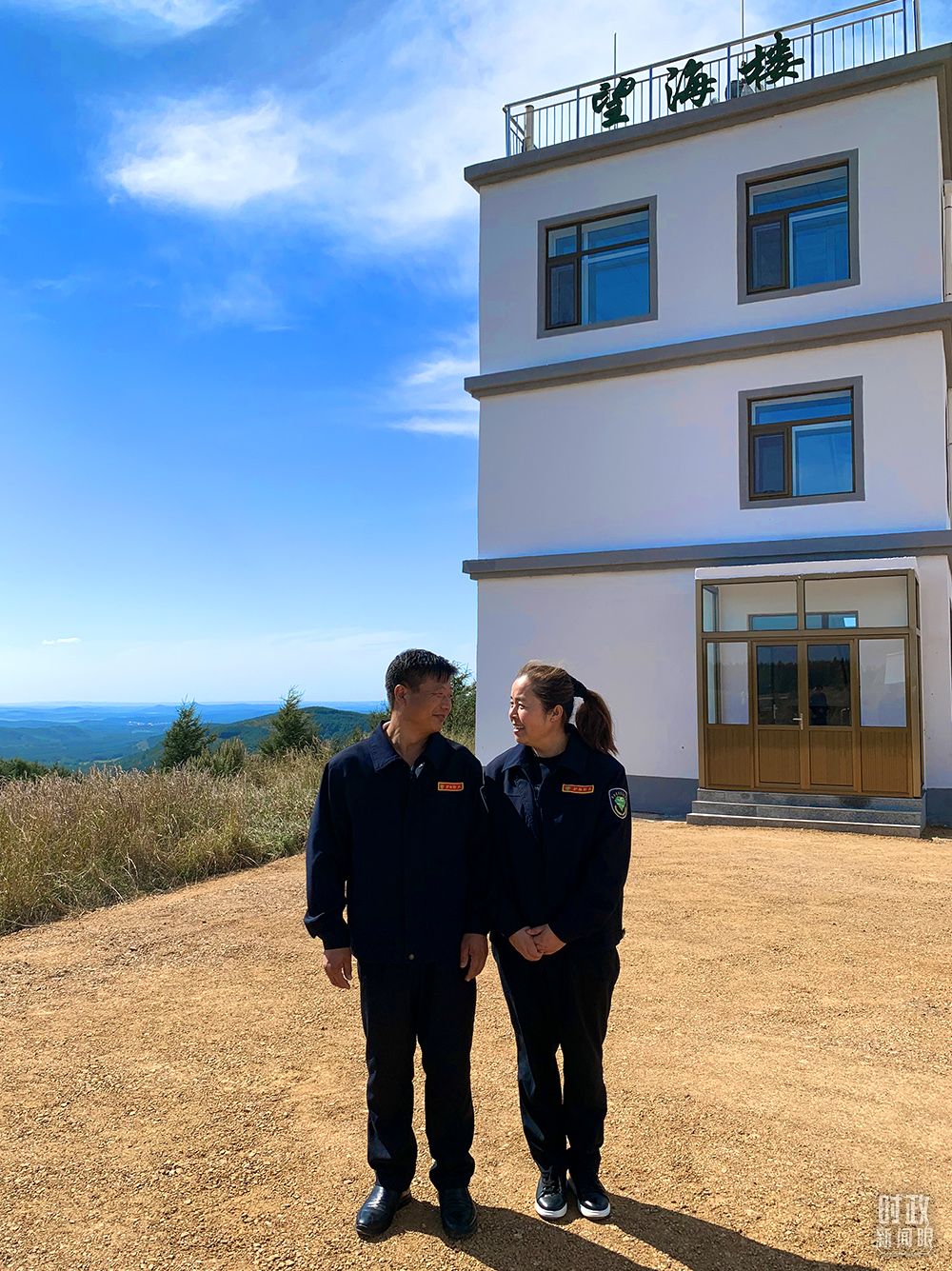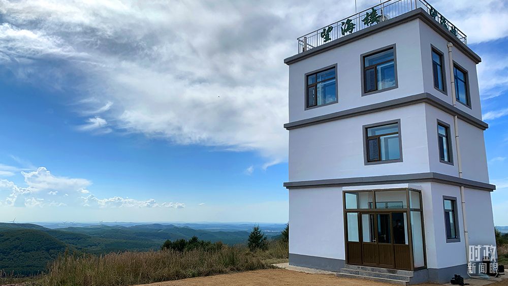 △月亮山上的“望海楼”(总台央视记者王鹏飞拍摄) 刘军、王娟夫妇是月亮山“望海楼”的护林防火瞭望员。刘军今年50岁,2008年和妻子王娟一起来到这里做林场瞭望员,一“望”就是13年。