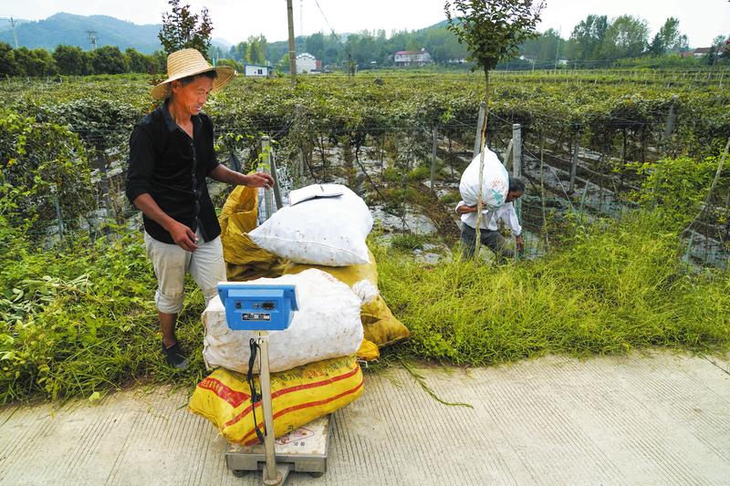 大洪山风景名胜区长岗镇东畈庄村村民日前将采摘的八月瓜准备装车外运。村民们说,今年种植的80亩八月瓜喜获丰收,每亩能收5000斤。果实香甜,根可药用,深受市场欢迎。