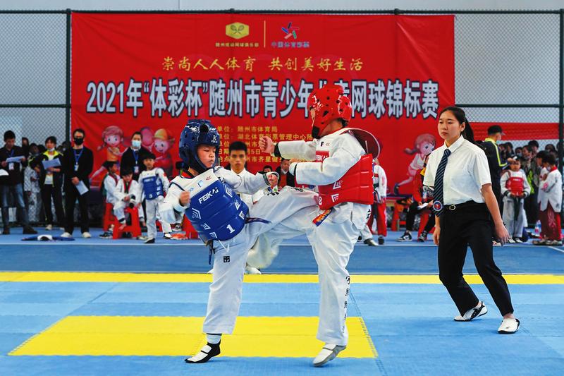 10月7日,湖北省首届社区运动会随州赛区少儿跆拳道比赛在随州齐星健身村举行。图为神农社区和吴家老湾社区代表队选手正在进行比赛。