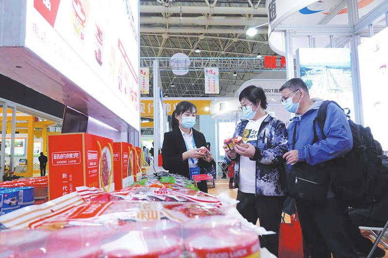游客在展馆选购香菇等产品。