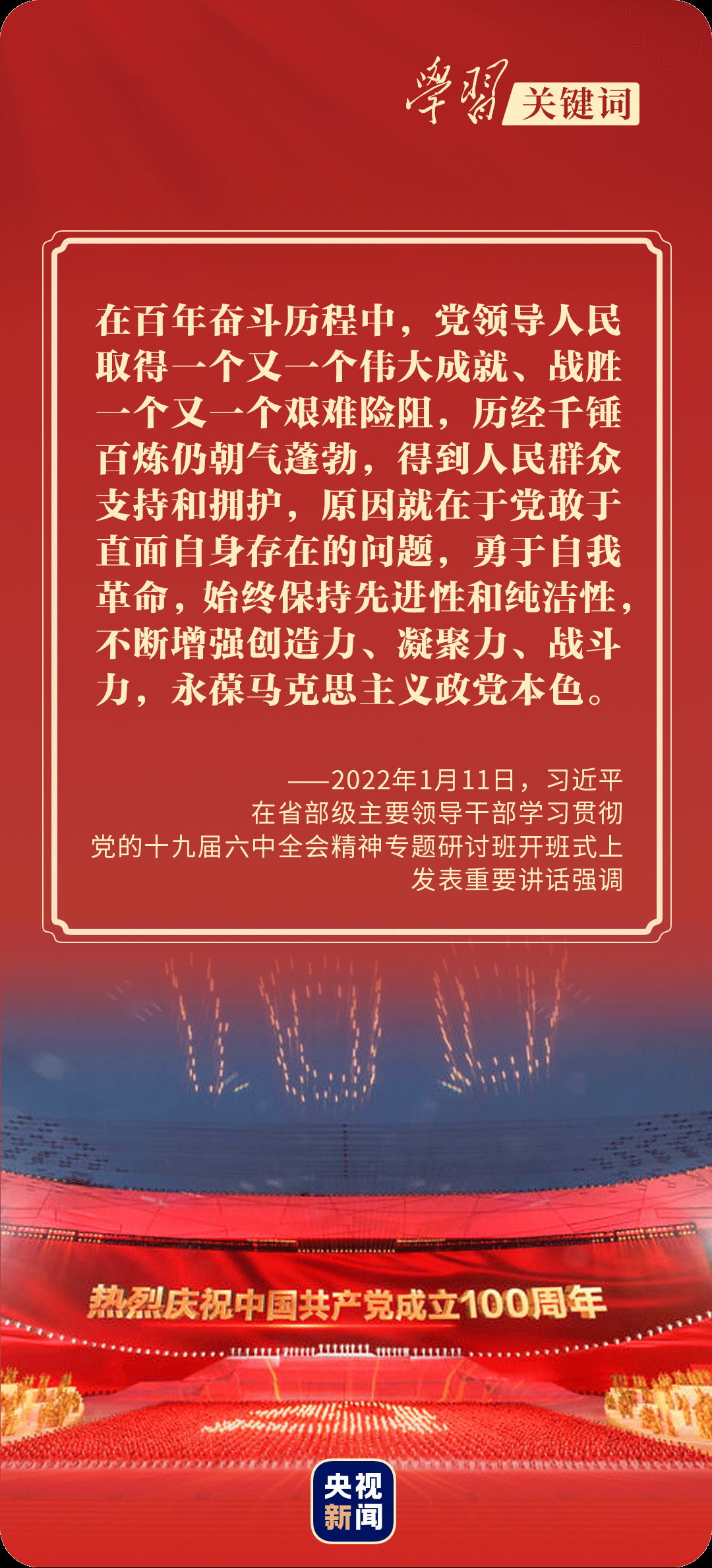 “我经常讲到历史周期率问题。” 2018年1月5日,在新进中央委员会的委员、候补委员和省部级主要领导干部学习贯彻习近平新时代中国特色社会主义思想和党的十九大精神研讨班开班式上,习近平总书记开宗明义—— “我们党执政正反两方面的经验,世界上一些社会主义国家和政党演变的教训,都揭示了一个道理:马克思主义政党夺取政权不容易,巩固政权更不容易;只要马克思主义执政党不出问题,社会主义国家就出不了大问题,我们就能够跳出‘其兴也勃焉,其亡也忽焉’的历史周期率。” 如何保证马克思主义政党不出问题? 习近平总书记强调:“要敢于进行自我革命,敢于刀刃向内,敢于刮骨疗伤,敢于壮士断腕,防止祸起萧墙。这就是为什么我们党要不断进行自我革命的根本意义所在。” 自我革命,有多难?有人打过这样一个比喻——犹如拿起手术刀,自己给自己动手术。回望百年党史,从八七会议、古田会议到遵义会议,从延安整风运动到十一届三中全会,再到新时代全面从严治党,我们党一次次拿起“手术刀”来革除自身的病症,解决问题。 我们党之所以伟大,不在于不犯错误,而在于从不讳疾忌医,敢于直面问题,勇于自我革命。 五年前,在省部级主要领导干部学习贯彻十八届六中全会精神专题研讨班上,习近平总书记指出,“我们党之所以有自我革命的勇气,是因为我们党除了国家、民族、人民的利益,没有任何自己的特殊利益。” 党的十九届六中全会上,总书记再次强调,“我们党没有任何自己特殊的利益,这是我们党敢于自我革命的勇气之源、底气所在。” 中国共产党历经百年沧桑依然风华正茂,其奥秘就在于具有自我净化、自我完善、自我革新、自我提高的强大能力。