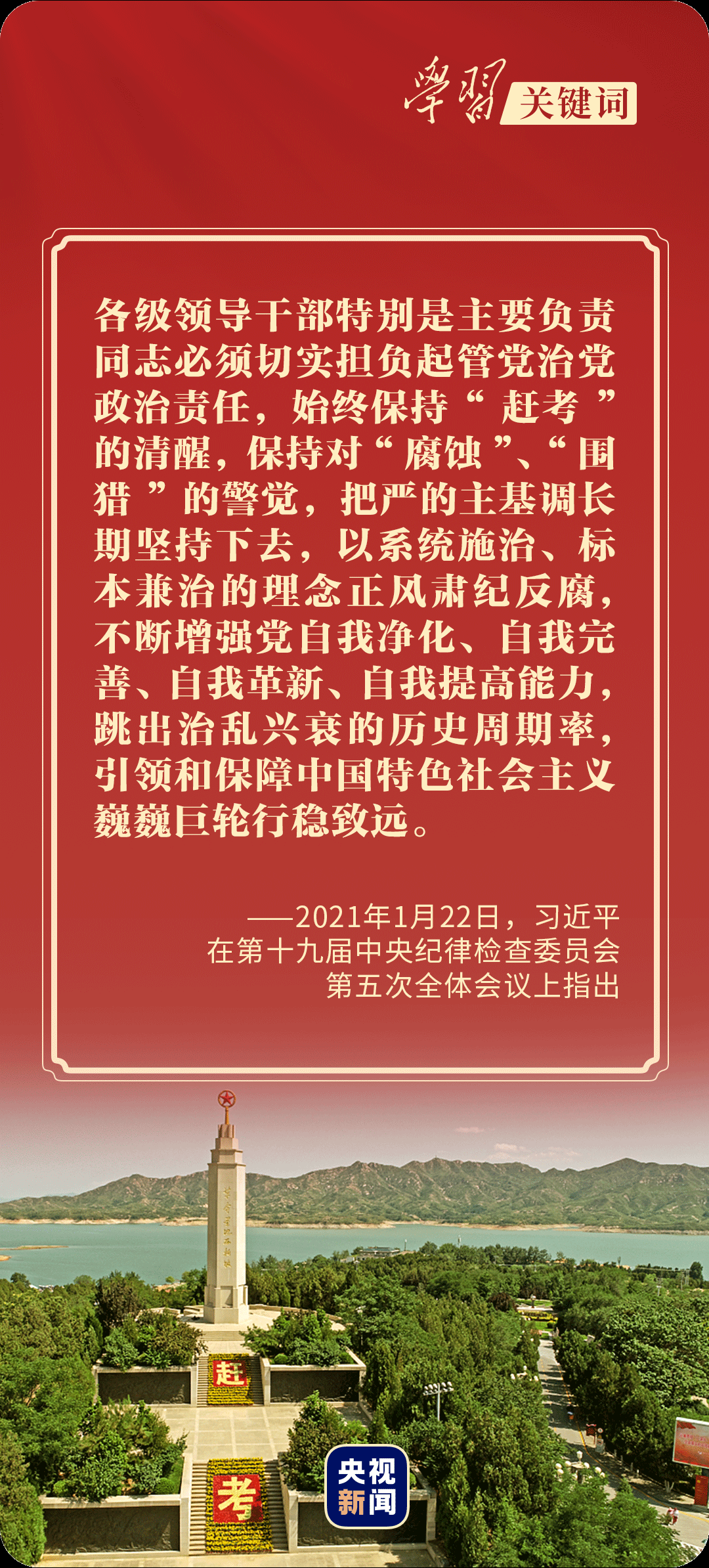 2014年1月14日,第十八届中央纪委第三次全体会议召开,习近平总书记以“猛药去疴、重典治乱”“刮骨疗毒、壮士断腕”来表示从严治党的勇气、决心与信心。 这一年底,总书记来到江苏镇江世业镇考察。告别时,村民们围了上来。老党员崔荣海紧紧握着总书记的手,激动地说:“你是腐败分子的克星,全国人民的福星!”总书记语气坚定:“不辜负全国人民的期望。” 正是这次江苏考察,习近平总书记首次提出全面从严治党,形成“四个全面”战略布局。 党的十八大以来,我们党以前所未有的勇气和定力全面从严治党,打了一套自我革命的“组合拳”,形成了一整套党自我净化、自我完善、自我革新、自我提高的制度规范体系。 “世界上那么多执政党,有几个敢像我们党这样大规模、大力度、坚持不懈反腐败?有些人吹捧西方多党轮流执政、‘三权鼎立’那一套,不相信我们党能够刀刃向内、自剜腐肉。”在党的十九届六中全会上,习近平总书记底气十足地说,“中国共产党勇于自我革命的实践给了他们响亮有力的回答。” 只有以反腐败永远在路上的坚韧和执着,深化标本兼治,保证干部清正、政府清廉、政治清明,才能跳出历史周期率,确保党和国家长治久安。