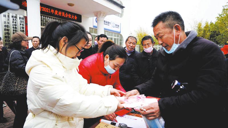 随县澴潭镇柏树湾村通过兴办人民公司发展乡村产业,推动资源变资产、资金变股金、农民变股东,探索出带领村民共同致富的新模式。近日,该村2021年度村民分红大会火热进行,“人民公司”股东高兴地依次上台领取分红现金。 (随州日报全媒记者李文军、通讯员韩铁流摄)