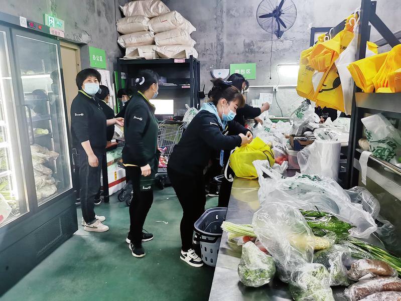 4月2日,在永辉超市吾悦广场店,工作人员拿着写满顾客需求的网上订单配备货品,分拣、分装、称重、打包等,整个流程紧张有序。超市线上不打烊、线下配送,居民足不出户就可以买到瓜果蔬菜、米面粮油这些生活必需品。