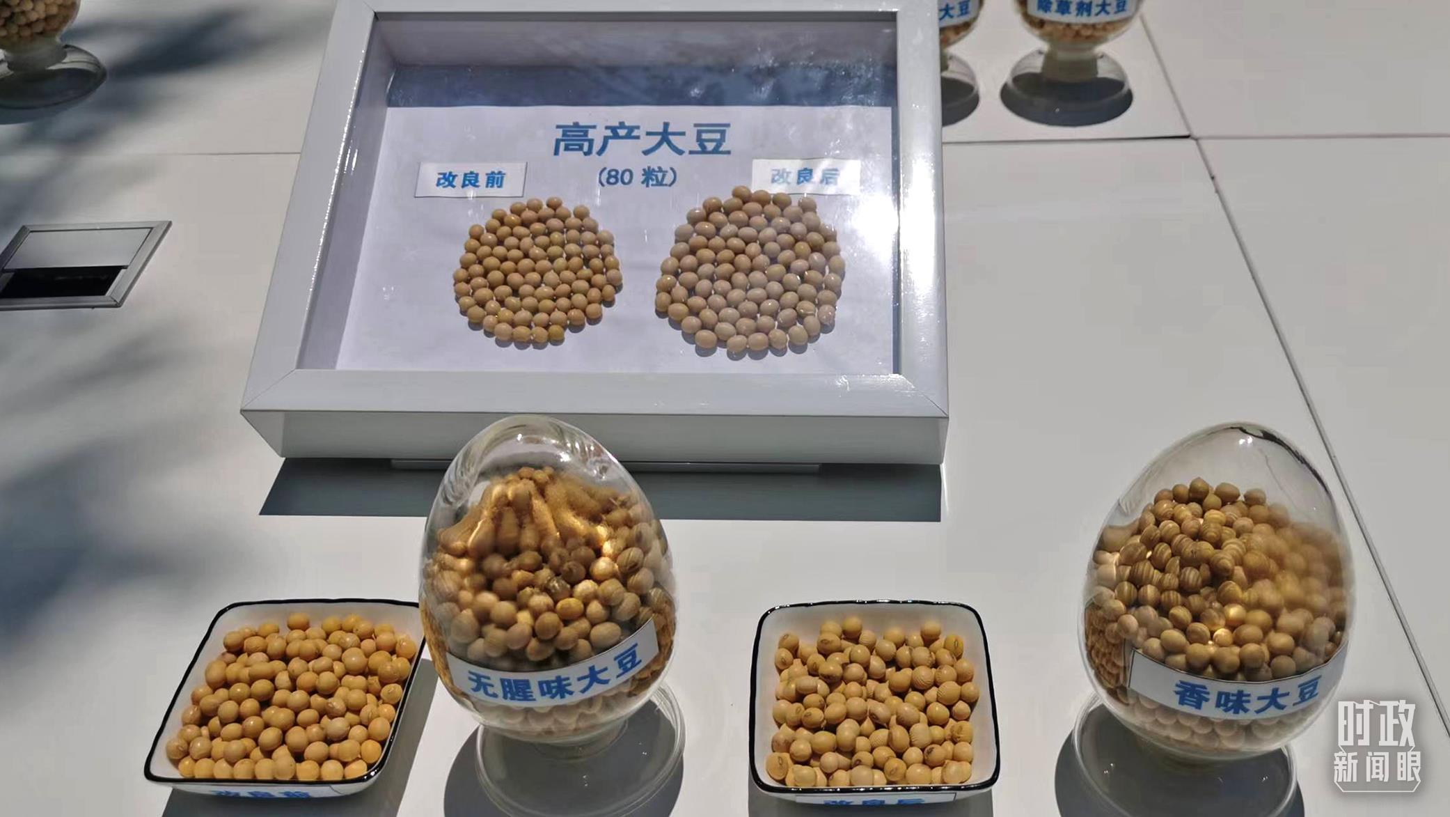△种子实验室展示改良前后的大豆样品。(总台央视记者钟锐拍摄) 今年全国两会期间,总书记在看望参加政协会议的农业界社会福利和社会保障界委员时指出,粮食安全是“国之大者”。悠悠万事,吃饭为大。解决吃饭问题,根本出路在科技。 育种在提高产量、增强抗性、改善品质、提高生产效率等方面作用显著。据介绍,优良种子可以贡献粮食增产量的45%—50%。