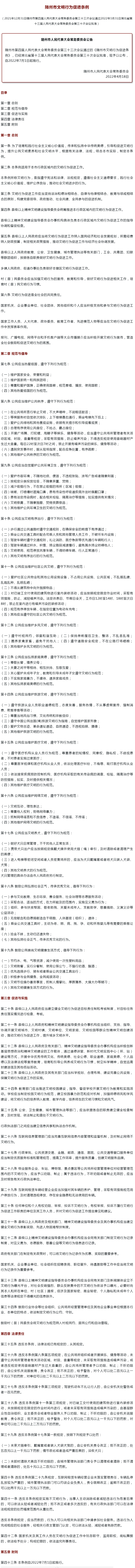 文明入法,引领市民向上向善 4月18日,市人大常委会举行《随州市文明行为促进条例》(以下简称《条例》)主题新闻发布会,解读《条例》的必要性、形成过程、主要内容及特点等。 “《条例》将社会主义核心价值观入法入规,旨在以法引领市民向上向善,进一步提升市民文明素质和社会文明程度。”市人大常委会秘书长王定志说。 该《条例》将于2022年7月1日起正式施行。 推动全市精神文明建设法治化 文明行为促进是文明建设的重要内容,与提升人民群众生活品质、提高城市品位密切相关,是推动经济社会高质量发展的重要环境保证。 近年来,我市以推进文明城市创建为抓手,积极开展文明行为促进工作,市民文明素质和城市文明程度明显提升,但一些不文明现象依然存在,且市民反映强烈,亟需通过立法予以规范。 市人大法制委员会主任委员、市人大常委会法工委主任王海涛说:“实行文明入法,将基本道德规范转化为法律规范,是不断满足人民日益增长的美好生活需要、适应经济社会高质量发展的现实要求,也是推动精神文明建设法治化的时代需求。” 《条例》是我市制定的首部关于精神文明建设的地方性法规。从起草到正式出台,历经一年多的时间,经过多次调研、修改、审议等,目前《条例》已由市四届人大常委会第三十三次会议通过,并经省十三届人大常委会第三十次会议全票批准,将于2022年7月1日起正式施行。 “《条例》制定过程中,有关专家学者、从业人员和社会公众积极参与、提出意见建议,体现了科学立法、民主立法、依法立法,是我市贯彻全过程人民民主的法治实践。”王定志说。 具体“促进什么”? 明确11个方面的行为规范 和2大方面的倡导行为 《条例》具体要“促进哪些行为”? 聚焦全市文明建设难点和群众关切热点,《条例》从热爱祖国、公共秩序、公共环境卫生、文明有序出行、社区公共文明、乡风文明、家庭美德、文明旅游、文明就医、文明上网、文明养犬11个大的方面,明确了公民需遵守的行为规范;从弘扬社会正气、传承优秀文化和文明健康生活方式两个大方面,明确了鼓励倡导的行为。 不同于以往重在明确“不能做什么”的“管理禁止型”立法,此次《条例》为“促进激励型”立法,着眼“应该做什么”,注重引导和倡导市民追求文明行为。“长期以来,促进公民自觉践行文明行为大多以教育引导为主,刚性约束不够。《条例》运用法律武器,明确了公民的行为规范和从道德层面倡导的行为,具有鲜明的规正和导向作用,为制止不文明行为提供了法律依据。”王海涛说。 坚持“问题引导立法、立法解决问题”,结合广泛调研、征集的情况,《条例》针对市民反映强烈的噪音扰民、驾驶机动车不礼让行人、不文明养犬、互联网租赁车乱停乱放等不文明现象,进行了详细的明确规范,并设定了处罚标准,使《条例》在依靠教育、劝导、激励等“软引导”的同时,兼具依法治理的“硬约束”。其中,《条例》对跳广场舞、室内装修等活动的禁止时间作出了明确规定。 全民广泛知晓、全社会共建 法的生命在于实施。围绕“怎么促进”,《条例》明确了相关责任主体在推进文明行为促进中的职责、措施。 据介绍,我市将建立健全文明行为促进目标责任制、文明创建机制和奖励帮扶机制等强化制度供给,教育、公安、城管、卫健、网信等重点单位将梳理完善各自在文明行为促进工作中的主要职责和重点任务,窗口服务行业、物业、景区景点等场所经营管理单位和共享车辆经营企业等特殊行业将突出示范引领作用,同时注重建立不文明行为举报、记录和通报机制,突出社会监督,引导全社会参与共建文明社会。 《条例》第三条规定“文明行为促进工作应当构建党委领导、政府推动、社会共建、全民参与的促进机制”,首次将党的领导写入我市地方性法规,为党委加强对文明行为促进工作的领导提供了制度保障。 市委宣传部文明创建综合科科长罗成表示,当务之急是充分利用各媒体平台资源,多形式、多渠道宣传《条例》,确保全社会知晓明了,为《条例》的贯彻实施打下坚实基础,促进培育和践行社会主义核心价值观、推进全国文明城市创建。 附:全文 |