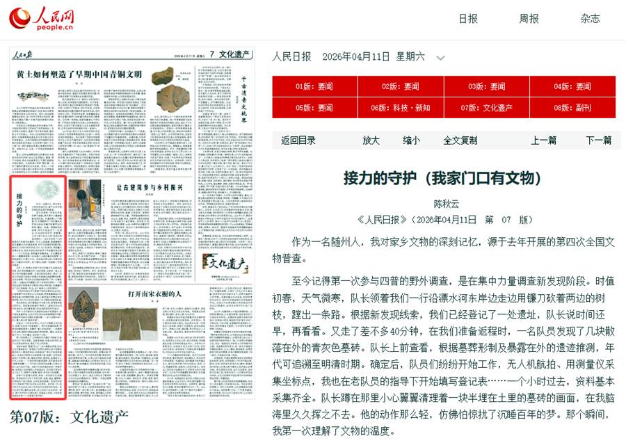 原载于《人民日报》2026年04月11日第7版 作为一名随州人,我对家乡文物的深刻记忆,源于去年开展的第四次全国文物普查。 至今记得第一次参与四普的野外调查,是在集中力量调查新发现阶段。时值初春,天气微寒,队长领着我们一行沿漂水河东岸边走边用镰刀砍着两边的树枝,蹚出一条路。根据新发现线索,我们已经登记了一处遗址,队长说时间还早,再看看。又走了差不多40分钟,在我们准备返程时,一名队员发现了几块散落在外的青灰色墓砖。队长上前查看,根据墓葬形制及暴露在外的遗迹推测,年代可追溯至明清时期。确定后,队员们纷纷开始工作,无人机航拍、用测量仪采集坐标点,我也在老队员的指导下开始填写登记表……一个小时过去,资料基本采集齐全。队长蹲在那里小心翼翼清理着一块半埋在土里的墓砖的画面,在我脑海里久久挥之不去。他的动作那么轻,仿佛怕惊扰了沉睡百年的梦。那个瞬间,我第一次理解了文物的温度。 当年5月,根据水利部门及何店镇文化站提供的信息,我们来到椒藤河村二组孙家畈,这里有一座上世纪70年代修建的渡槽。在登记相关信息时,旁边一位老大爷滔滔不绝地介绍着当年修建这座渡槽的故事,边说边感慨:“现在的生活是越来越好咯!”我一边填登记表,一边拿出手机翻看之前下发的培训资料——《第四次全国文物普查不可移动文物认定标准》,犹豫着问出了自己的疑惑:“队长,这个够得上认定标准吗?” “文物的价值在于它承载了特定时期的社会记忆,这座渡槽不仅仅是农业水利设施,更承载着集体化时期艰苦奋斗的精神内核,见证了新中国水利事业的发展历程,是几代人的记忆载体。”队长慢悠悠地回答道。 我突然明白,我们普查的不仅是文物,更是被具象化的时光。那些看似普通的“物件儿”,都是历史长河中的坐标点,标记着普通人的生活轨迹和时代变迁。 同年12月开展的补充调查和老城专项调查中,我们面临重重困难,比如产权私有的后续管理维护问题、老城保护与城市发展的矛盾问题……这个过程中的一件小事儿却让我“豁然开朗”。 在登记一户私有老宅时,户主不太情愿让我们进去,觉得“这老房子有啥看的”。我们没急着讲政策,而是和他聊起屋脊上的雕花、墙上的拴马桩……他渐渐打开话匣,跟我们讲起这座老宅的故事。最后,他主动推开大门:“你们量吧,是该留个念想。” 那一刻我明白了,文物保护的关键在于唤起“这是我的记忆”的认同感。法规是底线,但真正的守护,始于从自家老物件里,看见了自己的来路。 老城中曾经“辉煌”的工厂,如今静默在角落,如何让它们重获新生?我想起了去荆州洋码头学习考察时看到的令人振奋的尝试:在保留老厂房生产设备的基础上,打造江汉明珠工业成就展示馆;将原厂区空间改造成户外体育公园,增设足球场、篮球场;老建筑引入艺术工作室……文物利用的最高境界,或许就是这种“温柔的唤醒”——不打扰文物的历史叙事,只是为它注入当代生活气息。当孩子们在改造后的老厂房里奔跑,当年轻人在改建的工作室里办公,历史就不再是书本上的文字,而是可以触摸、感受、参与的生活场景。 四普不仅是清点家底,更是一次民族记忆的整理。那些被我们记录下来的古桥、老屋、遗址、墓葬等,共同构成了我们是谁、从何处来的答案。而如何对待它们,则体现了我们往何处去的思考。或许有一天,我们的工作也会成为这个时代如何对待历史的见证。我们记录文物,最终会发现,自己也成了这记录的一部分,每个时代的人们都在前人的基础上创造,又将成果传递给未来——这是接力的守护。 |