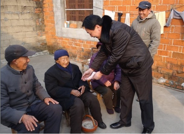 随县民政局副局长王安兵(右1)为尚市镇百岁老人王青英送上慰问金