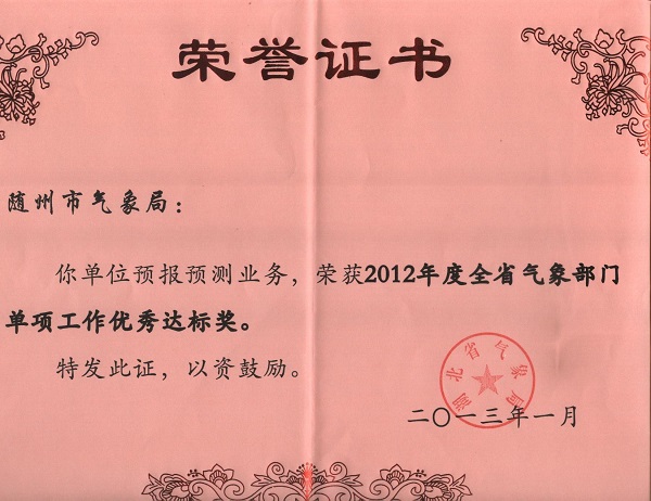 随州市气象局在2012年度荣获全省气象部门单项工作优秀达标奖。