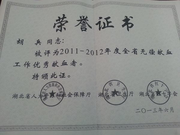 随县人民检察院干警胡兵同志无偿献血荣获省先进个人荣誉。