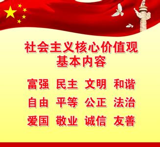 社会主义核心价值观主要由坚持马克思主义指导思想,坚持中国特色社会主义共同理想,坚持以爱国主义为核心的民族精神和以改革创新为核心的时代精神和坚持社会主义荣辱观组成。2012年11月,党的十八大报告首次以24个字概括了社会主义核心价值观:“倡导富强、民主、文明、和谐,倡导自由、平等、公正、法治,倡导爱国、敬业、诚信、友善,积极培育社会主义核心价值观。”