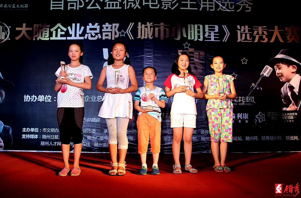 图为获选小演员合影 (图片拍摄:惟我独俊) 7月13日晚,经过三场海选和一场决选,随州市首届公益文化节公益微电影选秀活动落下帷幕,通过角逐,24号陈先桢、70号殷楚儿、9号董诗琪、42号周纯怡、19号罗丹胜出,他们通过试镜后将分别出演公益微电影《那年春天花正开》一、二、三号主角和配角。
