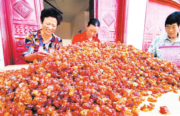 随县唐县镇华宝山村是该镇最大的油桃专业村,种植油桃曾经让许多果农脱贫致富,如今小小的桃胶更是成了果农致富的“金疙瘩”。图为村民正在对桃胶进行挑选分级。(随州日报全媒记者李文军摄)