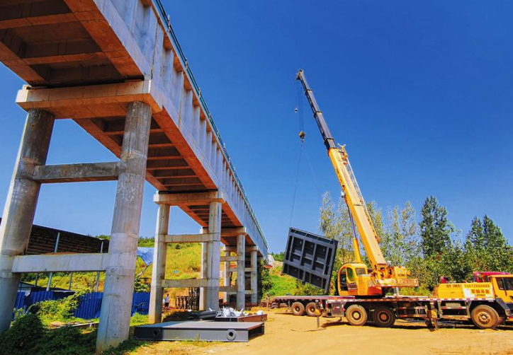 鄂北水资源配置工程随县标段顺利推进,位于随县高城镇境内全长320米的漂水渡槽主体结构22跨全部完工,该渡槽净断面12.09平方米,设计引水流量达11.6立方米每秒。图为渡槽钢制盖板吊装现场。(随州日报全媒记者李文军摄)