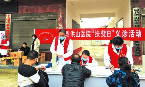 10月17日是全国第七个“扶贫日”,随县洪山医院医疗技术骨干深入洪山镇寺山居委会驻点村开展义诊活动。当天,接待咨询群众400多人次,发放各类宣传资料500余份,免费赠送药品价值2000多元。 (随州日报通讯员徐军赵杨陈传兵摄)