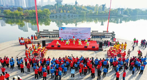 10月23日,重阳节来临之际,由随州市老干部局、随州市文化和旅游局主办,随州市老干部活动中心、随州市老年体育协会承办的2020年随州市老年人重阳登高(健步走)活动在文化公园拉开帷幕。图为太极协会表演的功夫扇《中国功夫》。(随州日报全媒记者李文军摄)