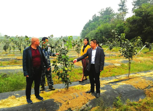 广水市十里财政所在做好财政惠农政策宣传的同时,积极引导农民调整农业产业结构。图为该所负责人带领专管员深入到观音村千亩黄金梨基地察看果树生长情况。 (随州日报通讯员操田力摄)