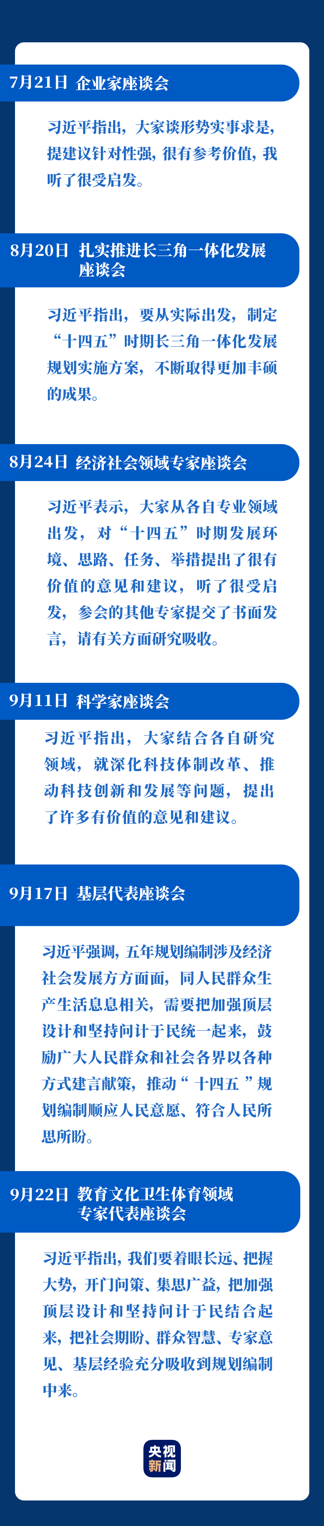 7月下旬到9月下旬,习近平总书记主持召开多场座谈会,以各种方式广泛听取各方面对“十四五”规划编制的意见和建议。