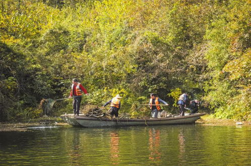 曾都区桃园河水库管理处为加强水源地保护,每天组织水库管理员开展巡库和打捞水面漂浮物,在保证洛阳镇区及周边3万余名群众饮水安全的同时,为当地守住青山绿水良好生态环境。 (随州日报全媒记者李文军摄)