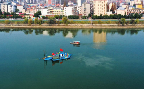 今年我市启动白云湖水环境提升工程,改善白云湖两岸人居环境,上下游白云湖清淤清库是重要内容之一。图为11月30日,一艘绞吸式挖泥船正在白云湖开展挖泥作业。 (随州日报全媒记者徐斌摄)