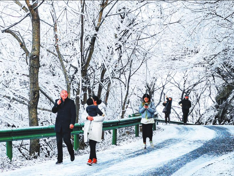 最近几天,受低温雨雪天气影响,大洪山风景区频频出现雾凇景观,山坡上、树林间,晶莹剔透的雾凇冰挂随处可见,范围广、景致美,吸引了大量游客前去观赏。 (随州日报全媒记者李文军摄)