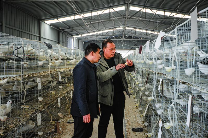 近两年,曾都区科经局、科协在扶贫攻坚战中,化“输血式”扶贫为“造血式”扶贫,在驻点扶贫村大力开展产业扶贫。先后在万店镇先觉庙村协助建立了大棚蔬菜、马铃薯种植、养鸽、稻田蛙等多种特色基地,不仅壮大了村集体经济,同时也带动了500余人脱贫。图为该村第一书记何巍正在白羽肉鸽养殖基地了解肉鸽繁育情况。 (随州日报全媒记者李文军摄)