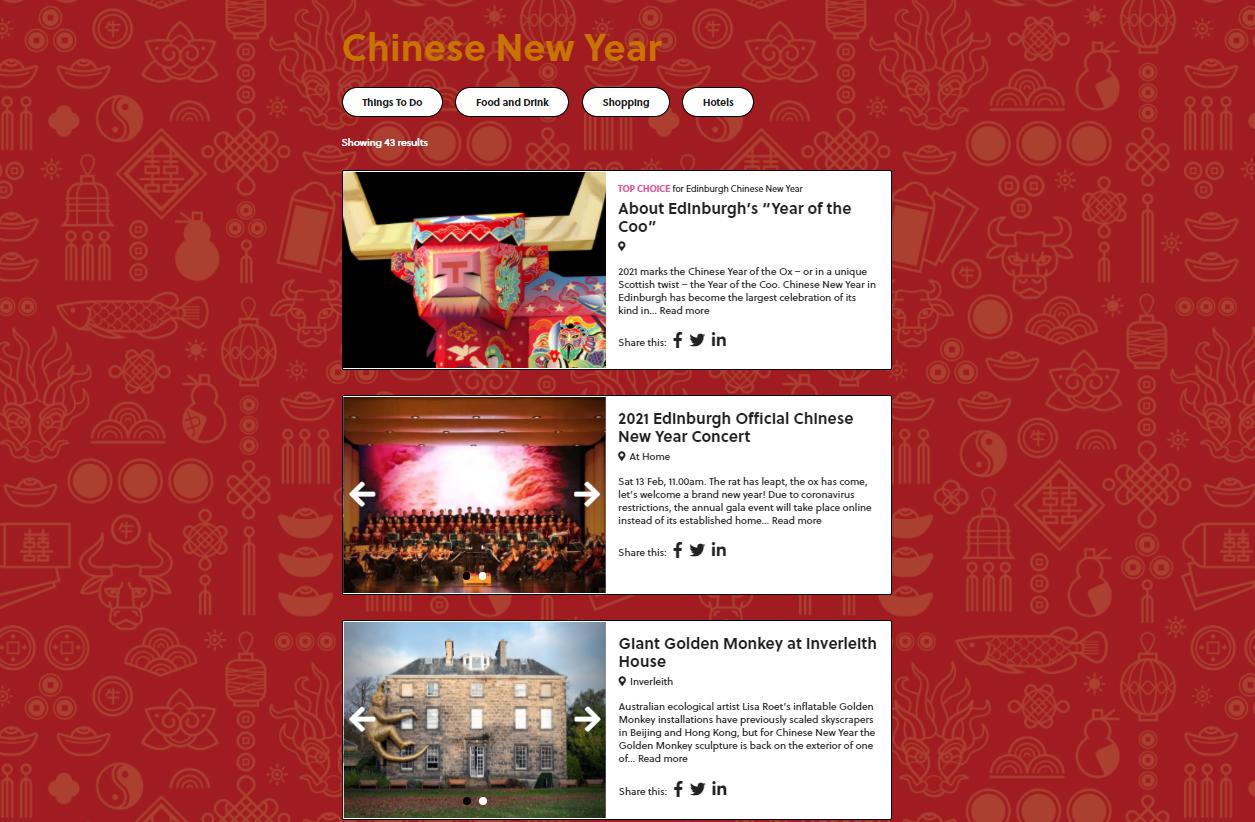 春节期间,英国苏格兰爱丁堡举办了一系列庆祝中国农历新年的活动,包括爱丁堡城堡点亮中国红、举办线上新春音乐会和植物园金丝猴雕像展等,为中国牛年增添了“苏格兰情调”。