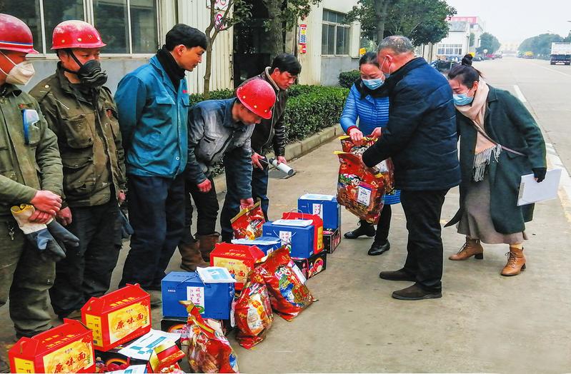 春节将至,曾都区总工会深入各企业开展“曾都留你过大年我们给你送温暖”活动,把党和政府的关怀及时送达广大职工的心坎上。图为曾都区总工会为泰晶电子公司春节期间坚守一线、留曾就地过年的职工送去面条、水果、糕点、口罩等暖心大礼包。(随州日报全媒记者李文军、通讯员谢晓摄)