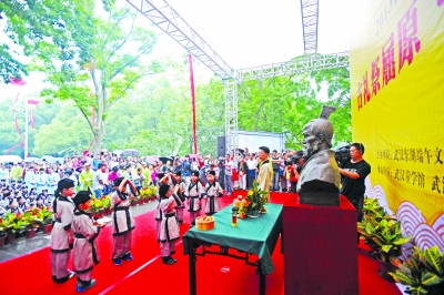 百名儿童古礼祭屈原 百名儿童古礼祭屈原 “帝高阳之苗裔兮,朕皇考曰伯庸。摄提贞于孟陬兮,惟庚寅吾以降……”6月10日上午10点半,东湖听涛景区滨湖画廊前舞台,武汉童学馆的100名小朋友身着楚服、伴着楚乐,齐声朗诵《离骚》,以古礼的方式祭祀屈原。 台上8名小朋友经过了奉祭品、敬香、敬酒、送祭文四个环节后,百名身穿楚服的小朋友,随着老师一起稚声稚气地朗诵《离骚》,模样可爱又不失庄严。6岁的阔阔在舞台上朗诵了祭文,200字左右的祭文他只学习了两天,便能流利地朗诵。 祭祀结束后,童学馆的徐适老师告诉记者:“现在的大人对中国的传统节日越来越陌生,孩子们就更不熟悉了。这已经是童学馆第4次在端午节进行古礼祭祀屈原仪式,就是想让小朋友感受和了解传统节日,在东湖大自然里感受民俗和传统文化的魅力。” 与往年不同,在百童古礼祭屈原结束后,童学馆还精心准备了一台国学韵味十足的综艺汇演,老师和小学员们以不同的表演形式,带着游客了解国学经典、学习传统礼仪。 今明两天,东湖端午文化节还有精彩的传统文化节目。在12日的赛诗会上,主办方将万元寻找“背诵王”,凡参加赛诗会的小选手,第一个将《离骚》全文背诵,将获得万元奖励。本次赛诗会分幼儿组和少儿组,现场可免费报名。