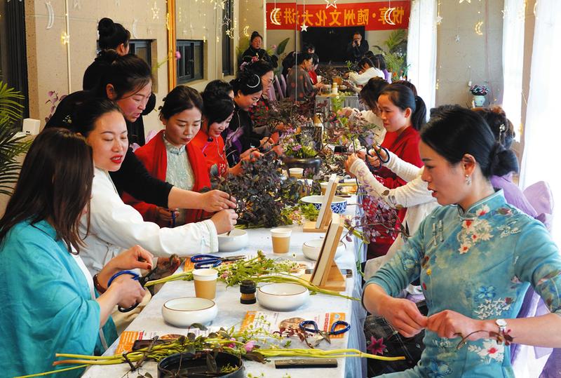 3日7日,乐蕴文化与樊登读书联合开展插花艺术体验活动,庆祝“三八”妇女节。花艺布置专业老师为插花艺术爱好者现场讲解指导,大家将普通的花草变成一件件赏心悦目的艺术品。(随州日报全媒记者李文军摄)