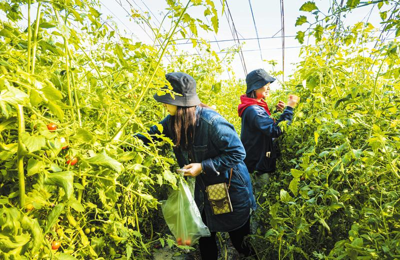随州高新区淅河镇康华农业有限公司打造我市首家现代农业展览馆,集大棚光伏、育种育苗、休闲观光采摘、教学教研等多功能于一体,集中展示现代农业种植管理技术。图为市民正在大棚采摘西红柿。(随州日报全媒记者李文军摄)