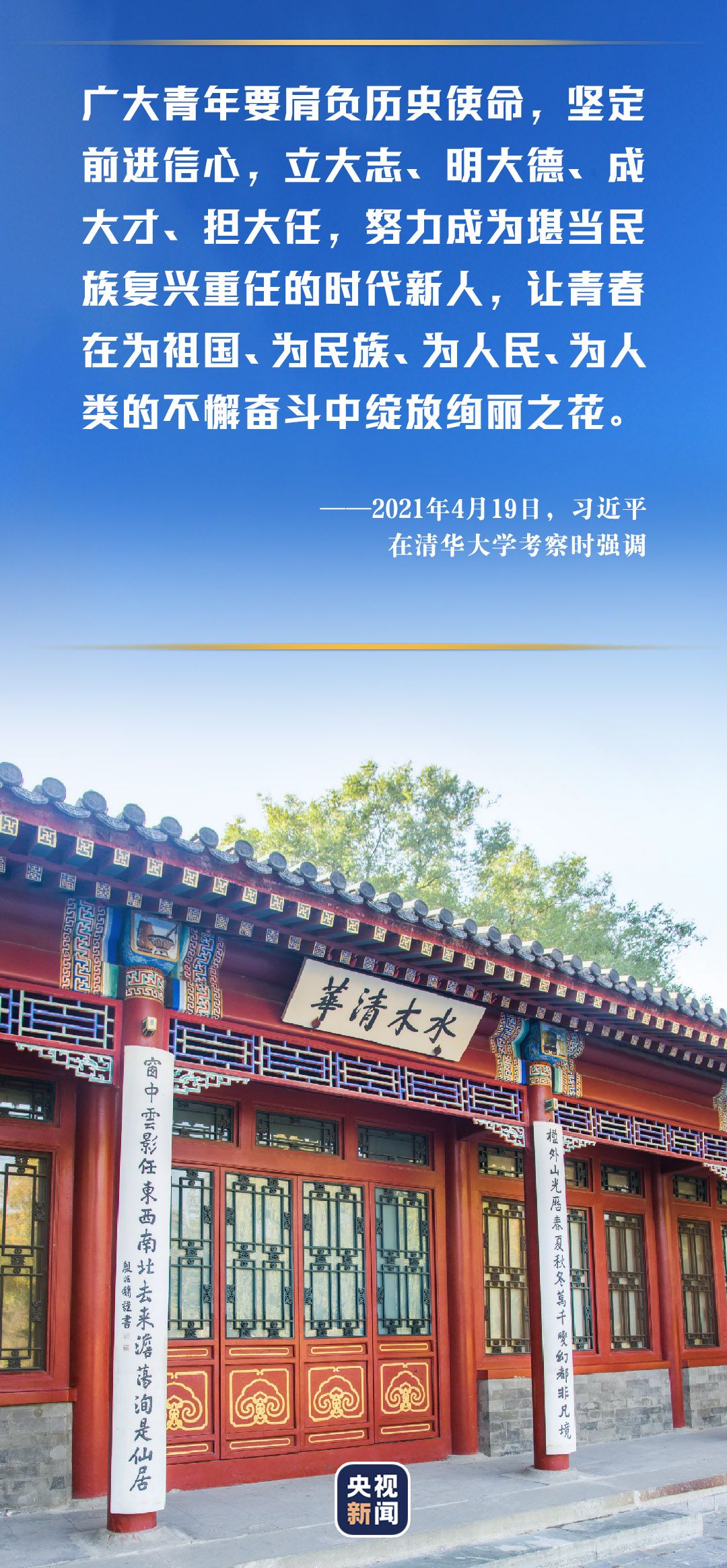 △2021年4月10日,三千余名清华师生、校友相聚清华园,用奔跑庆祝建校110周年。 在清华大学参观美术学院校庆特别展时,习近平强调,“要发挥美术在服务经济社会发展中的重要作用”,“要增强文化自信,以美为媒,加强国际文化交流”。面对体育馆内一张张朝气蓬勃的笑脸,习近平勉励大家“坚持德智体美劳全面发展,努力成为祖国建设的栋梁之才”。 当代中国青年是与新时代同向同行、共同前进的一代,生逢盛世,肩负重任。 今年是中国共产党成立100周年。牢记总书记嘱托,爱国爱民,从党史学习中激发信仰、获得启发、汲取力量,不断坚定“四个自信”,不断增强做中国人的志气、骨气、底气,树立为祖国为人民永久奋斗、赤诚奉献的坚定理想……广大青年重任在肩。