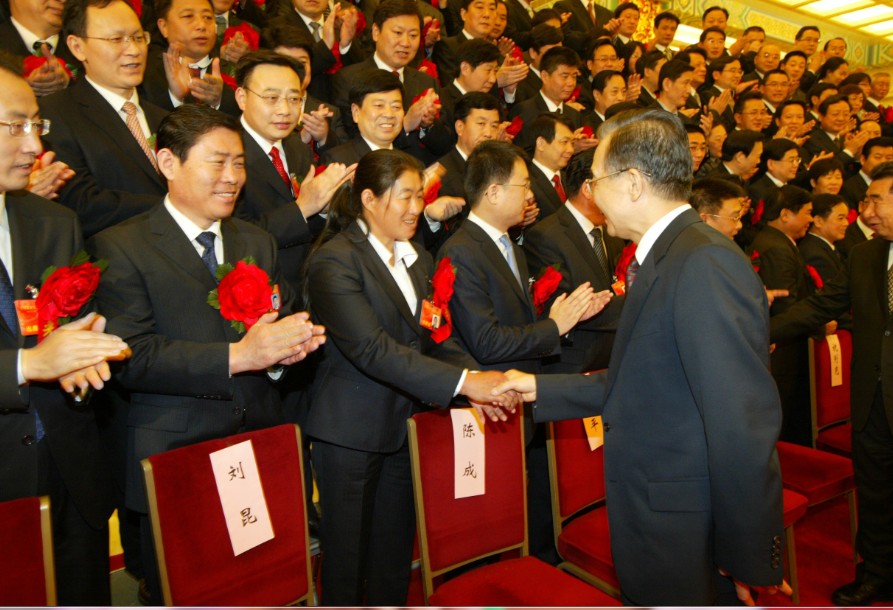 在全县农业系统和社会各界的共同努力下,随县连续三年被国务院授予全国粮食生产先进县.温家宝总理在人民大会堂亲切接见受表彰的全国粮食生产先进单位代表。(二排左二为中共随县县委副书记、县长张健)