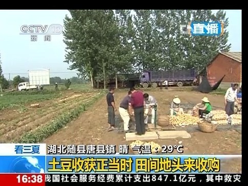 中央电视台新闻频道现场直播随县唐县镇马铃薯高产创建示范片土豆收获,每亩鲜薯产量4451.9公斤,连续4年夺得我省马铃薯单产第一