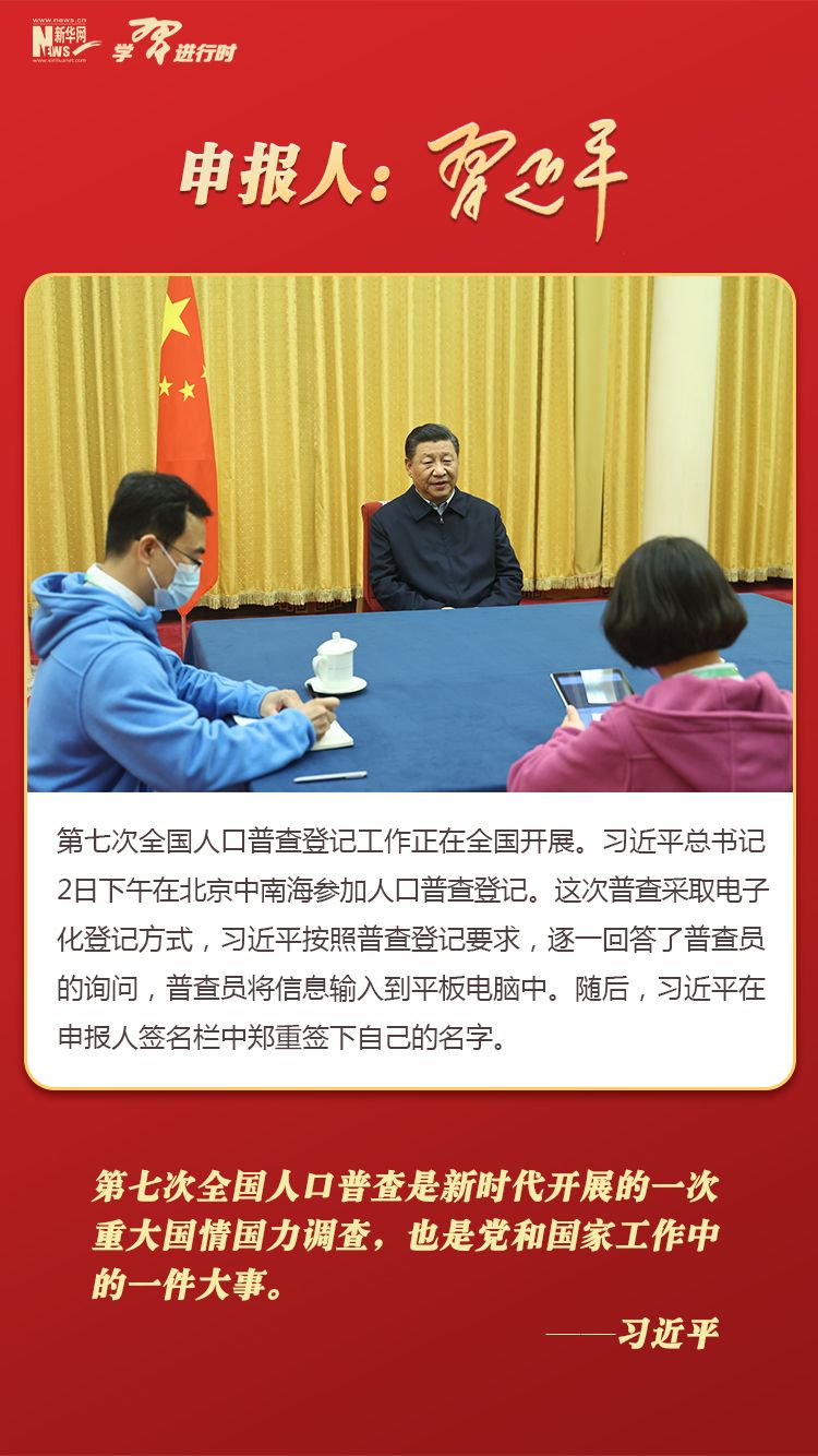 习近平在北京中南海参加全国人口普查登记,带头申报。他按照普查登记要求,逐一回答了普查员的询问,并在申报人签名栏中郑重签下自己的名字。 “第七次全国人口普查是新时代开展的一次重大国情国力调查,也是党和国家工作中的一件大事。”习近平意味深长地说。 近年来,我国人口发展出现了一些显著变化,既面临人口众多的压力,又面临人口结构转变带来的挑战。 习近平强调,要通过这次人口普查查清我国人口数量、结构、分布等方面情况,把握人口变化趋势性特征,为完善人口发展战略和政策体系、制定经济社会发展规划、推动经济高质量发展提供准确统计信息支持。 人口普查,一个都不能少。大国点名,有你,有我,有我们每一个中国人。 14亿分之一的你,有多重要 据第七次全国人口普查数据显示,全国人口共14亿多人。作为14亿分之一的你,有多重要?