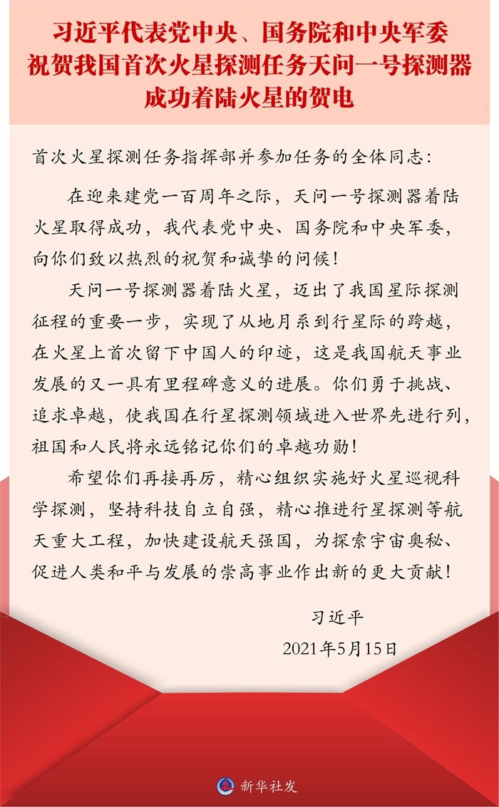 【学习进行时】5月15日,我国首次火星探测任务着陆火星取得成功。习近平总书记致贺电,向首次火星探测任务指挥部并参加任务的全体同志致以热烈的祝贺和诚挚的问候。新华社《学习进行时》原创品牌栏目“讲习所”今天推出文章,为您解读。 2021年5月15日,火星上首次留下中国人的印迹。 7时18分,天问一号探测器成功着陆于火星乌托邦平原南部预选着陆区,我国首次火星探测任务着陆火星取得成功。习近平总书记第一时间发来贺电,为首次火星探测任务指挥部并参加任务的全体同志点赞。 贺电全文300余字,正所谓“纸短情长”,字里行间满含着豪情。