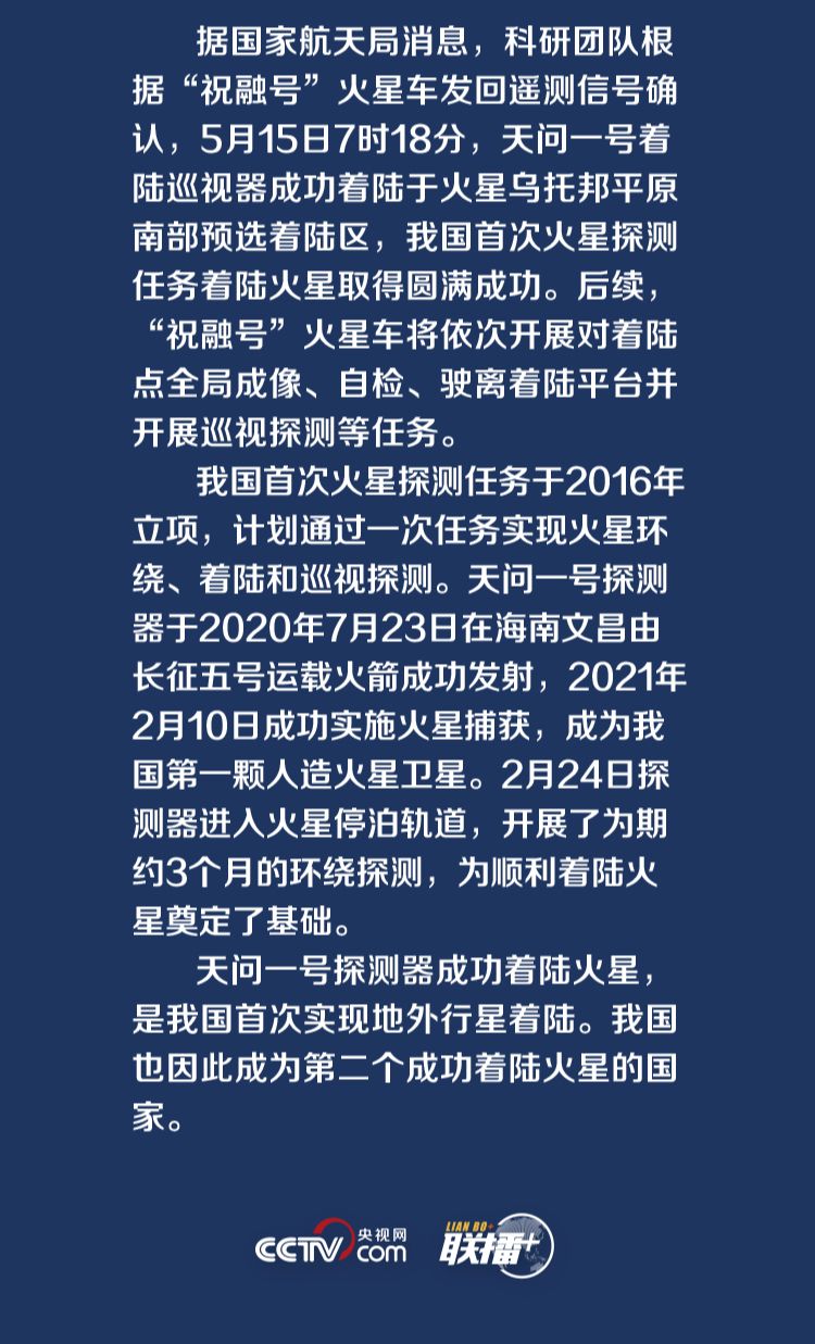 联播+ “天问一号探测器着陆火星,迈出了我国星际探测征程的重要一步,实现了从地月系到行星际的跨越,在火星上首次留下中国人的印迹,这是我国航天事业发展的又一具有里程碑意义的进展。”5月15日,习近平代表党中央、国务院和中央军委致电祝贺我国首次火星探测任务天问一号探测器成功着陆火星。