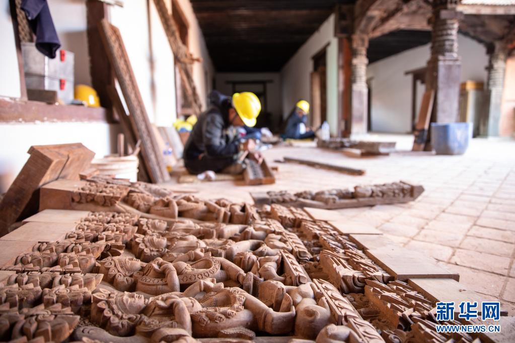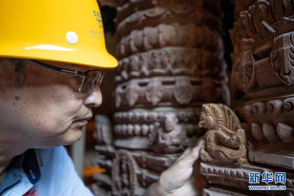 2019年10月10日,在尼泊尔加德满都杜巴广场,中国派出的文物修复队技术主管周建国在九层神庙修复现场查看一个修复好的文物。新华社记者 王婧嫱 摄 马来西亚新亚洲战略研究中心主席翁诗杰说,构建人类命运共同体在当前形势下尤为迫切,中国努力推进文保、减贫、生态等领域的对话合作,夯实共建人类命运共同体的人文基础。