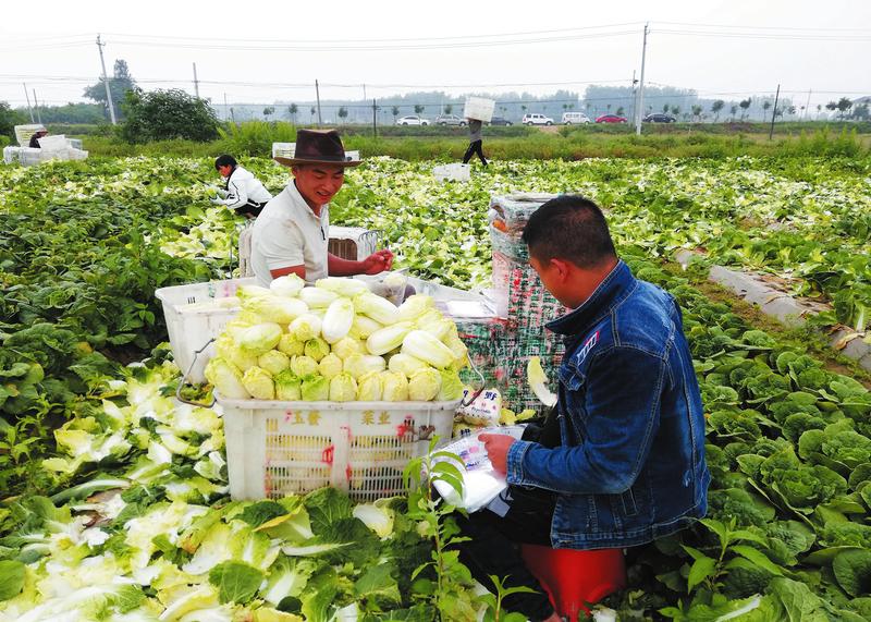 广水市太平镇左家河村从云南引进宏大种养殖专业合作社,流转河滩地200余亩种植娃娃菜,近期喜获丰收。图为收割包装现场。 (随州日报全媒记者毛传荣、通讯员冯先国摄)