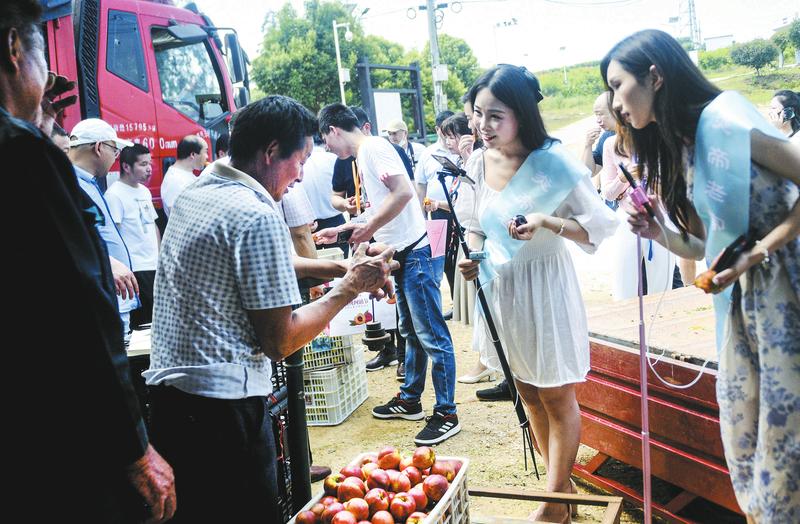随县近日在“油桃之乡”尚市镇举办2021随县油桃网销节,吸引了阿里巴巴、天猫等大型平台商参与网销。图为阿里巴巴集团的网红现场直播销售油桃。