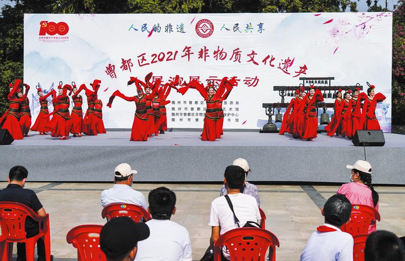 6月2日,曾都区2021非物质文化遗产展演在神农公园举行。该展演静态和动态相结合,展示了曾都区非物质文化遗产项目。图为编钟乐舞《随州神韵》。(