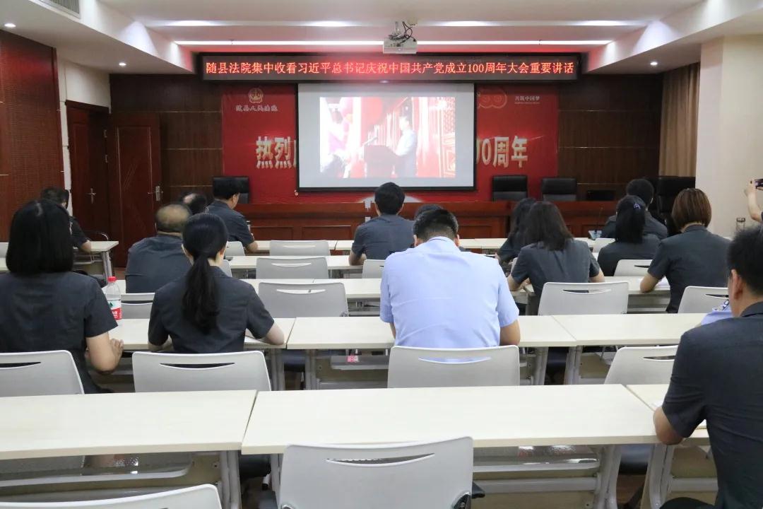 | 7月1日上午8时,庆祝中国共产党成立100周年大会在北京隆重召开,随州两级法院认真组织全体党员干警收听收看庆祝中国共产党成立100周年大会,聆听习近平总书记的重要讲话。 随州市中级人民法院组织全院110余名党员干警、雇员制书记员在二楼会议室集中收看庆祝大会直播。 随县人民法院组织机关全体干警在会议室集中收看,各基层法庭组织干警利用法庭视频设备或者电脑、手机等移动设备就地收看。 广水市人民法院以支部为单位组织全体党员干警收看,并就地举行支部主题党日活动,深入讨论习近平总书记的重要讲话精神。其中该院党组书记、院长张珍同志到下沉社区广水市应山办事处跑马场村委会参加支部主题党日活动,同村支部党员一起观看庆祝大会,聆听习近平总书记的重要讲话,并在村支部主题党日会上给全体村支部党员讲授了专题党课。 曾都区人民法院组织全体干警在该院六楼会议室集中收看庆祝大会现场直播。 在收听收看中,随州两级法院干警认真聆听了习近平总书记的重要讲话,大家都为党百年奋斗历程中铸就的伟大建党精神而感动,为党团结带领中华民族和中国人民创造的辉煌成就而自豪。 大会结束后,广大党员干警仍然心绪难平、激动不已,纷纷表示要积极响应习近平总书记和党中央的号召,在新的征程上,牢记初心使命,坚定理想信念,践行党的宗旨,深入贯彻落实习近平法治思想,认真履行宪法和法律赋予的神圣职责,坚持公正司法、司法为民,积极发挥审判职能作用,全力维护社会公平正义,满足人民群众多元化司法需求,为实现人民对美好生活的向往而不懈努力! |