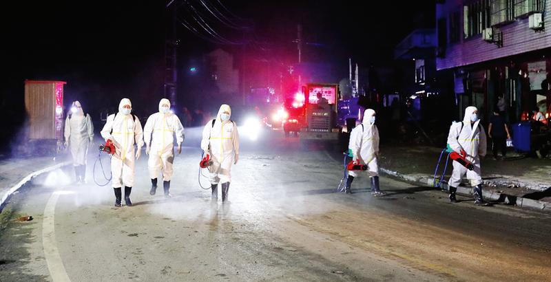 8月14日晚,随县柳林镇街道,卫生防疫人员继续开展环境消杀作业,确保大灾之后无大疫,为灾后重建创造必要的卫生条件。 (随州日报全媒记者徐斌摄)