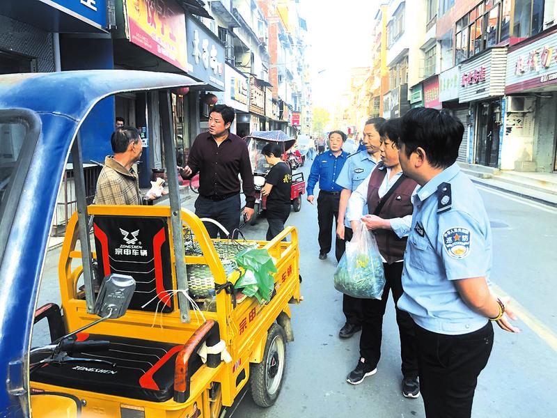 曾都区西城办事处双龙寺社区加强辖区背街小巷环境秩序整治,保持干净整洁有序,助力文明城市建设。图为巡逻专班对随意卖菜的小贩进行劝导。
