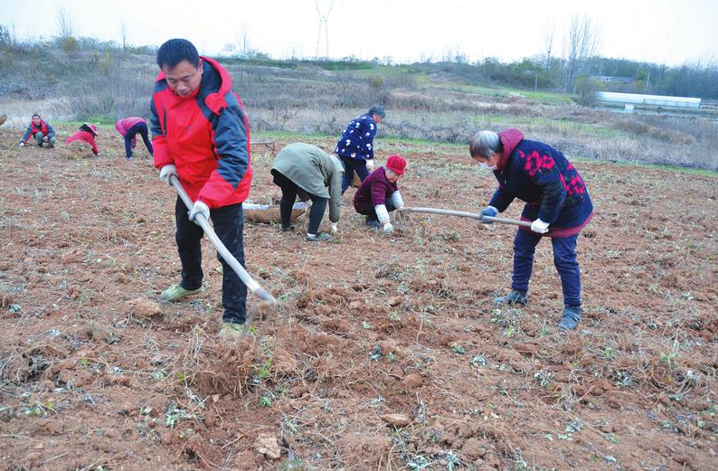 12月14日,市艾草产业协会组织专家组深入会员种艾基地,指导冬季艾草间苗、疏根、取苗、碎根、播种、施肥、开沟技术。图为艾草专家在随县鹏诚艾草种植专业合作社带领社员一起取苗。 (随州日报通讯员石守京摄)